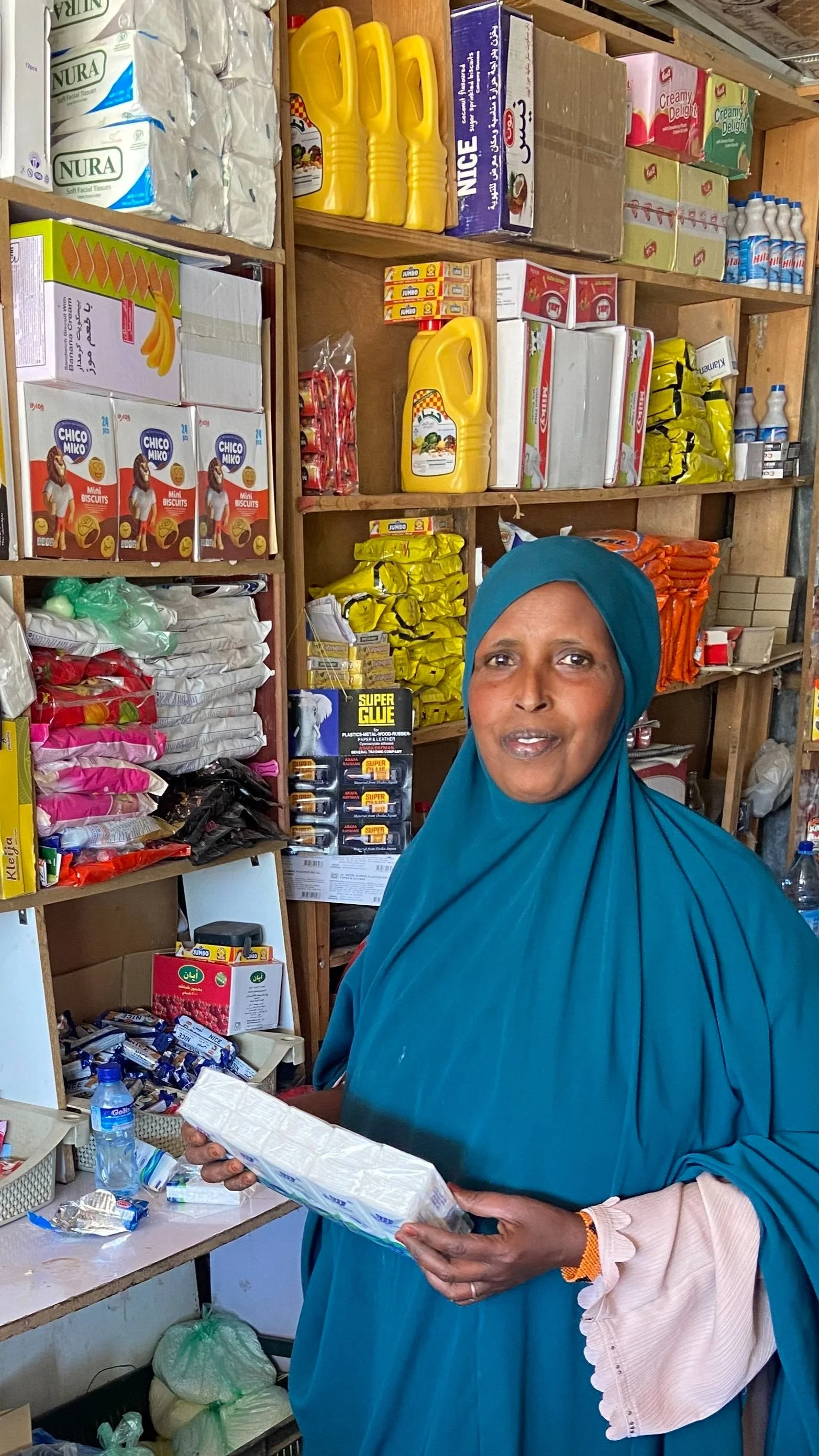 Before opening her grocery shop, Deeqa Carab Cabdilaahi’s life was physically demanding. As a vegetable seller, she spent long hours walking from shop to shop, delivering produce. Determined to build a more stable livelihood, she sought financial support. With her background in a Village Savings and Loan Association (VSLA), Deeqa had already received business, numeracy, and finance training. This knowledge gave her the confidence to apply for a loan from the District Banking Committee (DBC) in Arabsiyo. Understanding the loan process, she secured the $500 funding she needed to expand her business