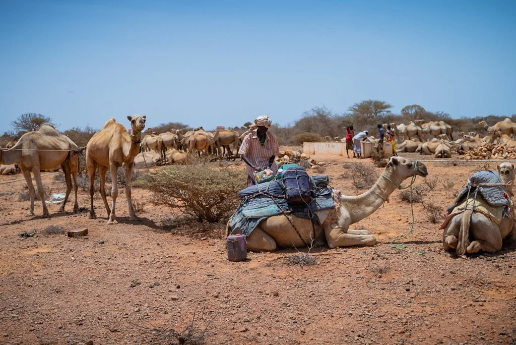A pastoralist is loading water onto his camel with the aim of transporting it to his home in the remote villages of Diilin