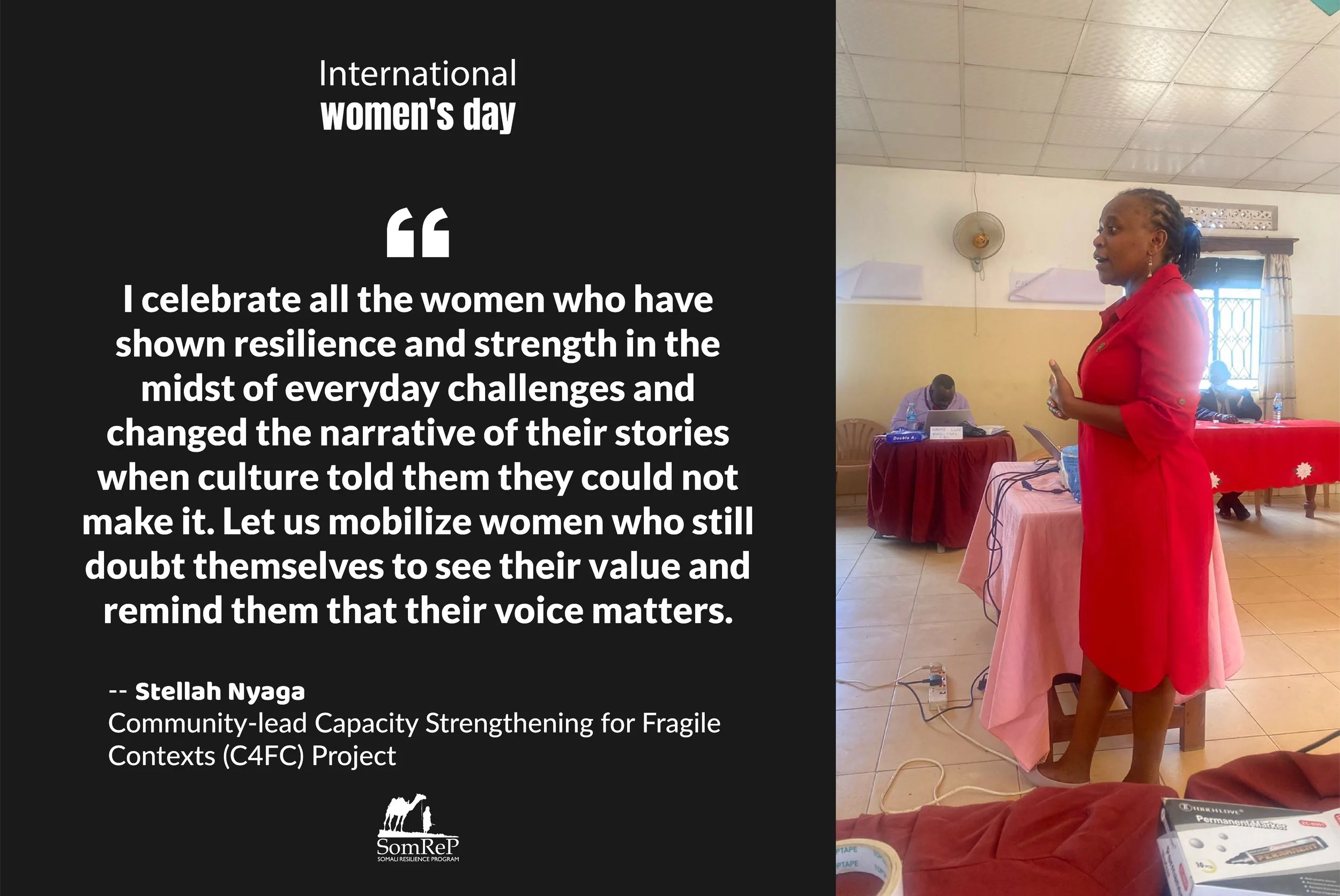 “I celebrate all the women who have shown resilience and strength in the midst of everyday challenges and changed the narrative of their stories when culture told them they could not make it. Let us mobilize women who still doubt themselves to see their value and remind them that their voice matters.” - Stellah Nyaga, Community-lead Capacity Strengthening for Fragile Contexts (C4FC) Project