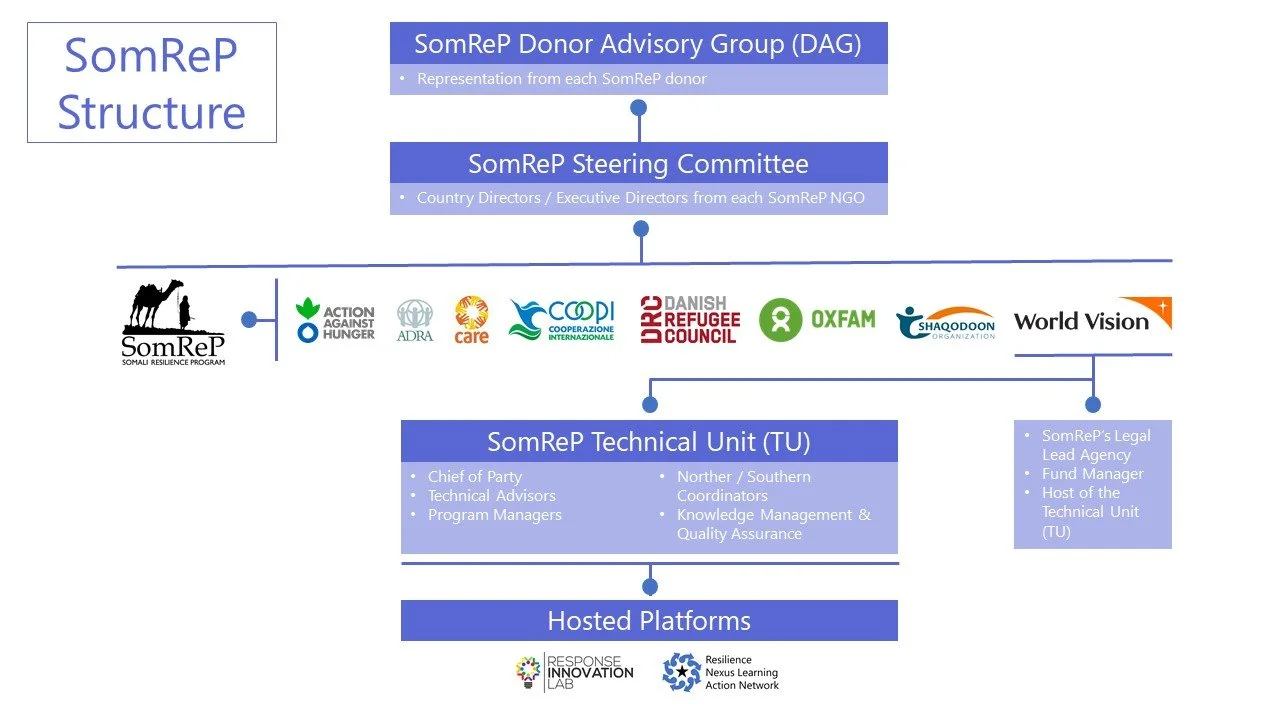 The SomReP’s overall leadership is provided by the Steering Committee, made up of members’ Country Directors. The Steering Committee meets quarterly to ensure strict compliance and accountability of partners. In addition, effective coordination and program oversight are achieved principally through SomReP’s Donor Advisory Group (DAG) who meet quarterly to consult, and receive reports and key updates from the SomReP consortium.